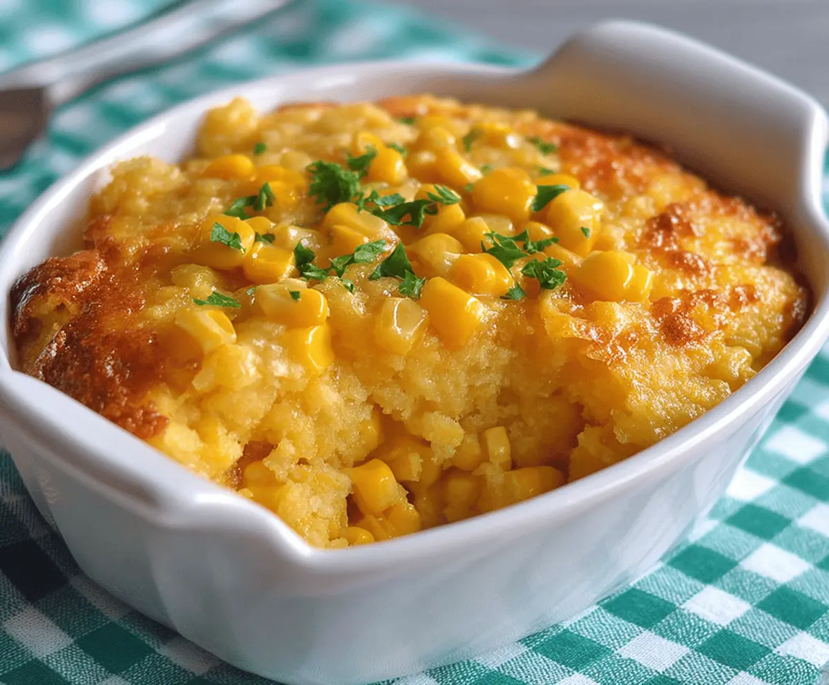 Creamy sweet corn casserole topped with golden crispy crust, served in a baking dish, perfect for family dinner or holiday gatherings.