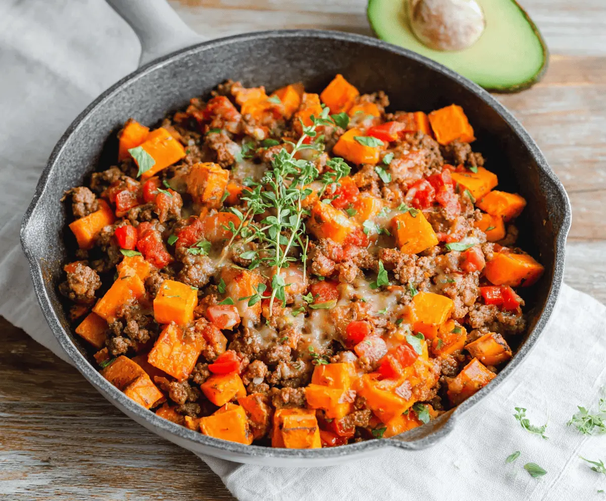 Delicious sweet potato and ground beef skillet served in a bowl, garnished with herbs.