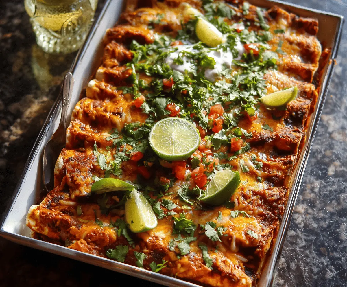 Once out of the oven, garnish your enchiladas with chopped cilantro, dollops of sour cream or Greek yogurt, and halved cherry tomatoes if you’re using them. Serve with lime wedges on the side for a fresh squeeze of zest!