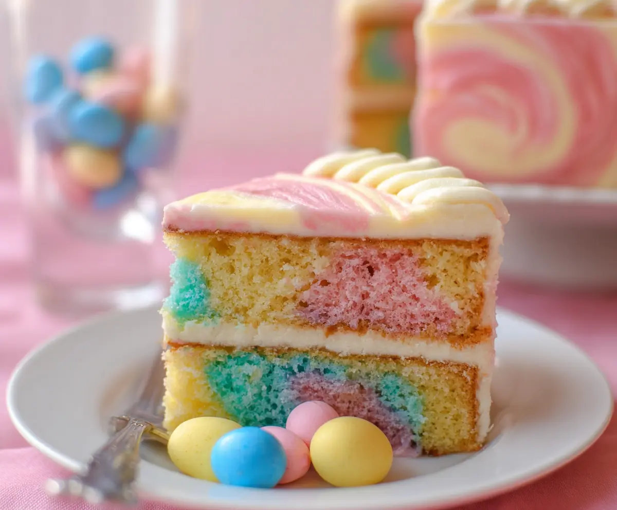 Finally, slice into your delightful Swirled Easter Cake to reveal the colorful, confetti-style interior. Enjoy the smiles and excitement it brings to your celebration!