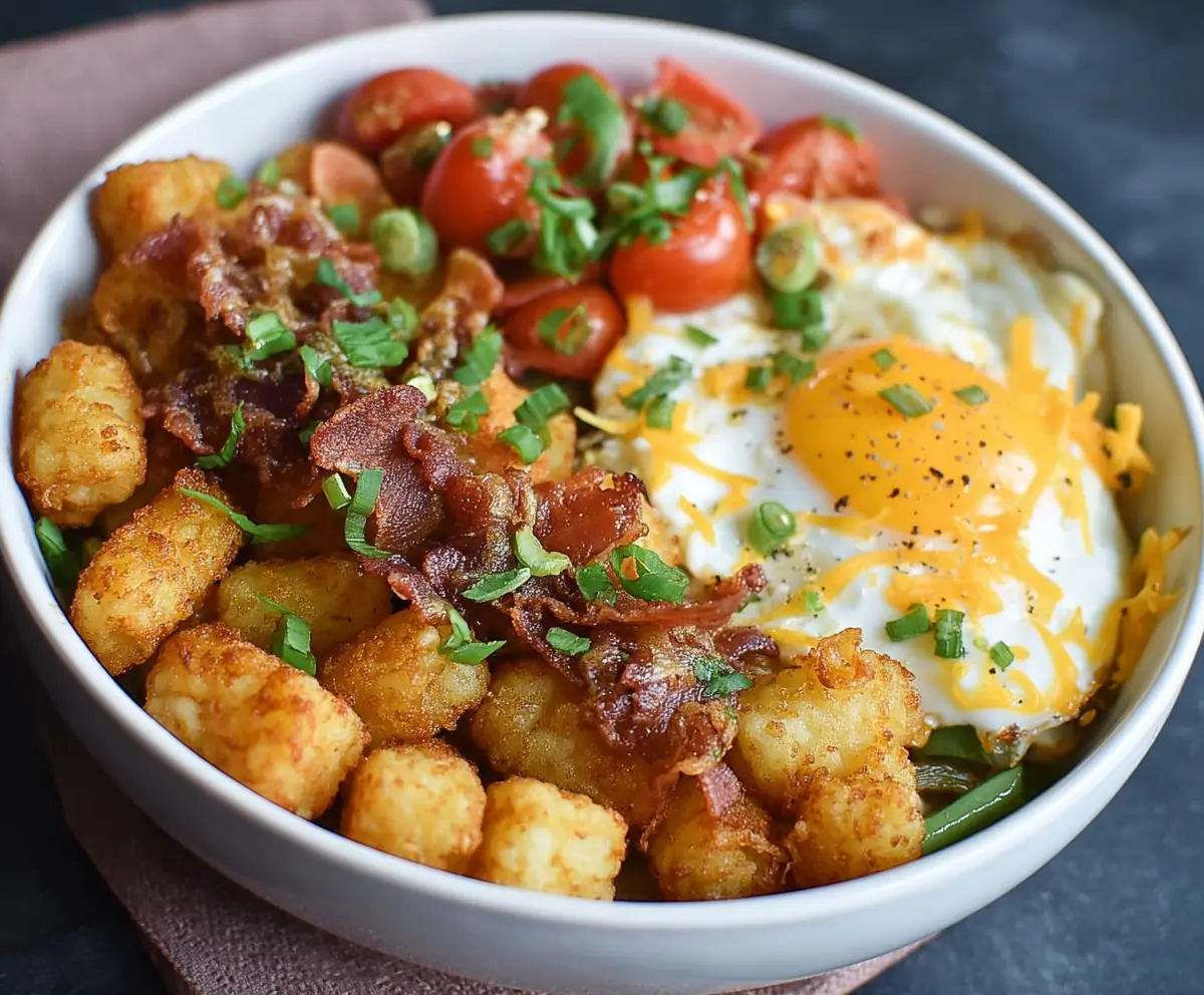 This Tater Tot Breakfast Bowl is a fun and tasty way to start your day! It’s loaded with crispy tater tots, eggs, cheese, and all your favorite toppings.