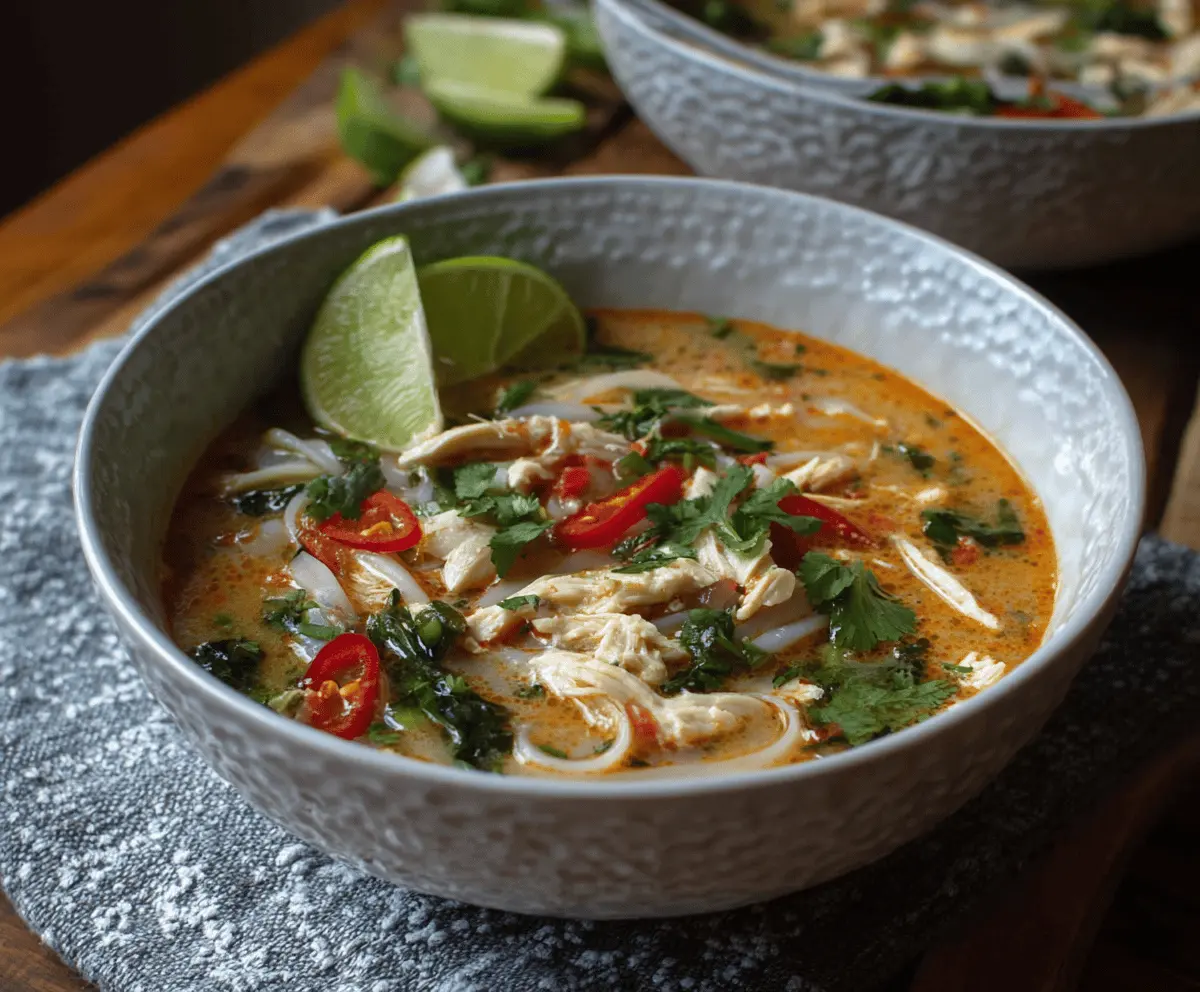 This Thai Chicken Noodle Soup is packed with flavor! It’s cozy, creamy, and has a hint of spice that will warm your heart. Plus, it’s filled with tender chicken and soft noodles!