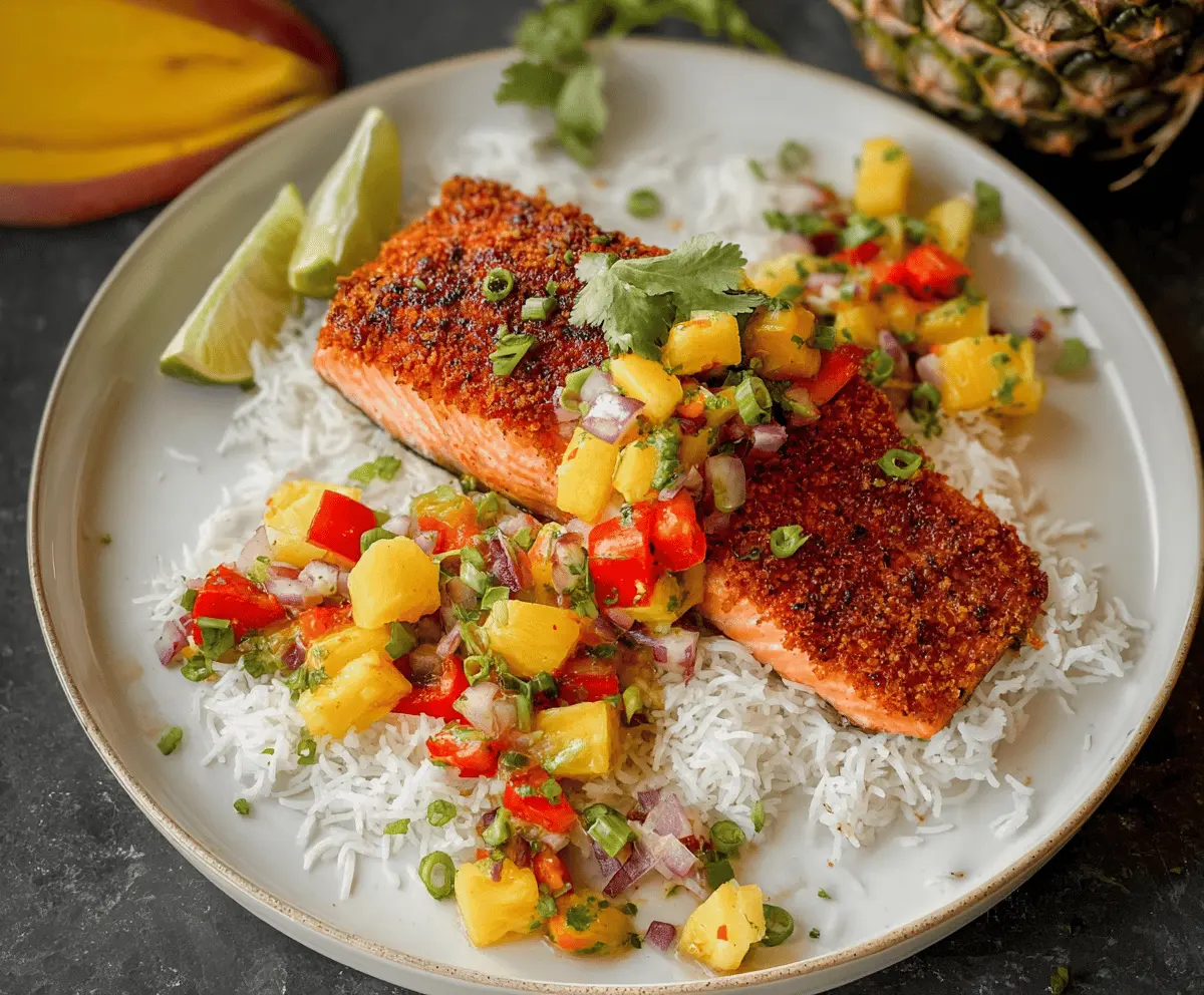 Dig into your delightful tropical feast! Relish in the vibrant flavors of the coconut-crusted salmon paired beautifully with the sweet and tangy pineapple salsa. It’s simply irresistible!