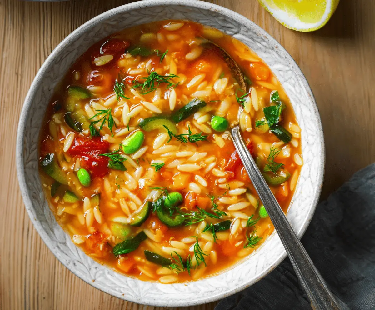 Hearty Vegetable Orzo Soup in a bowl with fresh vegetables and herbs, perfect for a healthy and comforting meal